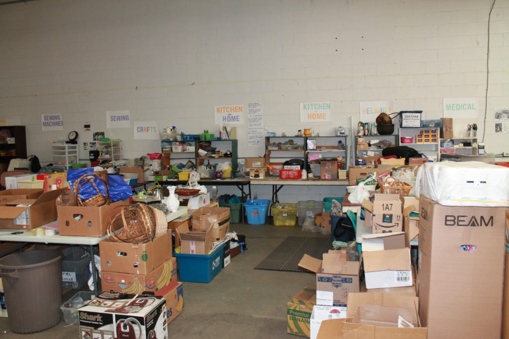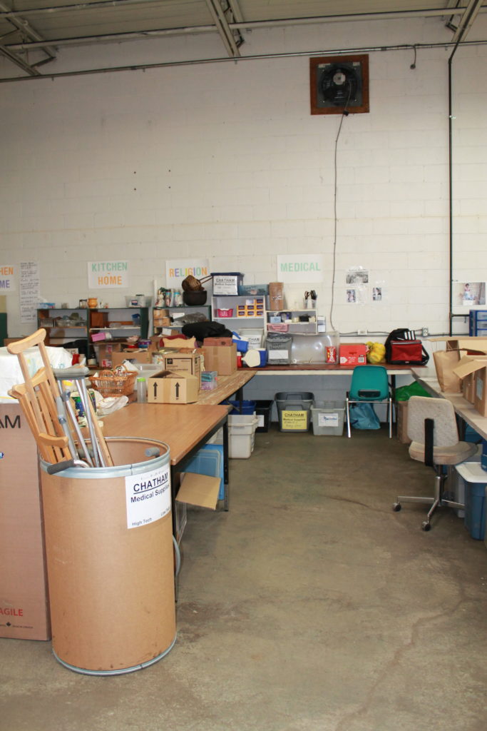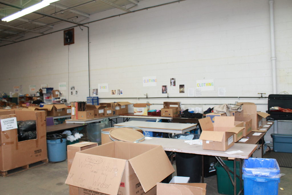 Area for sorting and packing of clothes.Area for sorting and packing kitchen supplies: pots, pans, utensils, bowls and more.Packing area for food.Sorting and packing area for school supplies.Packing area for tools, garden equipment and toys.Sorting and packing area for medical supplies: including gloves, masks, disinfectants, soap, scrub uniforms and more.